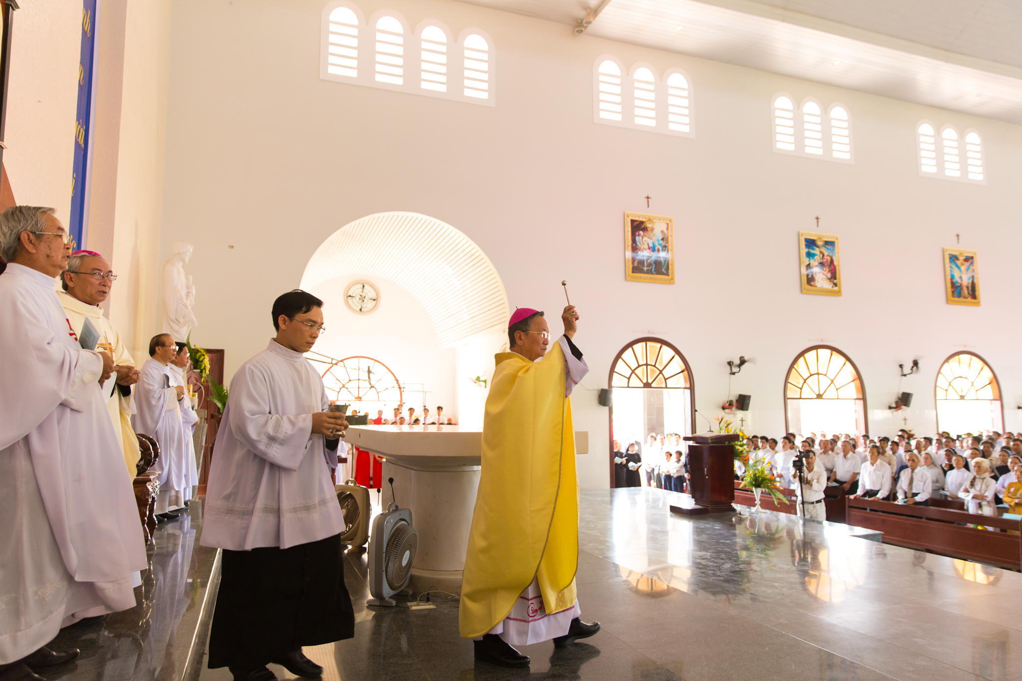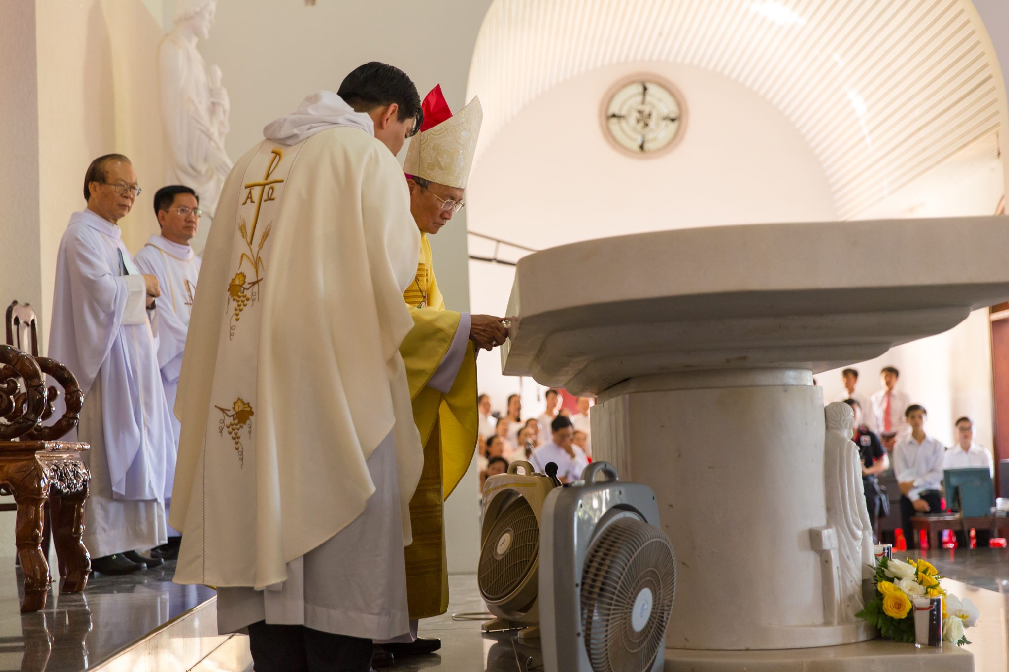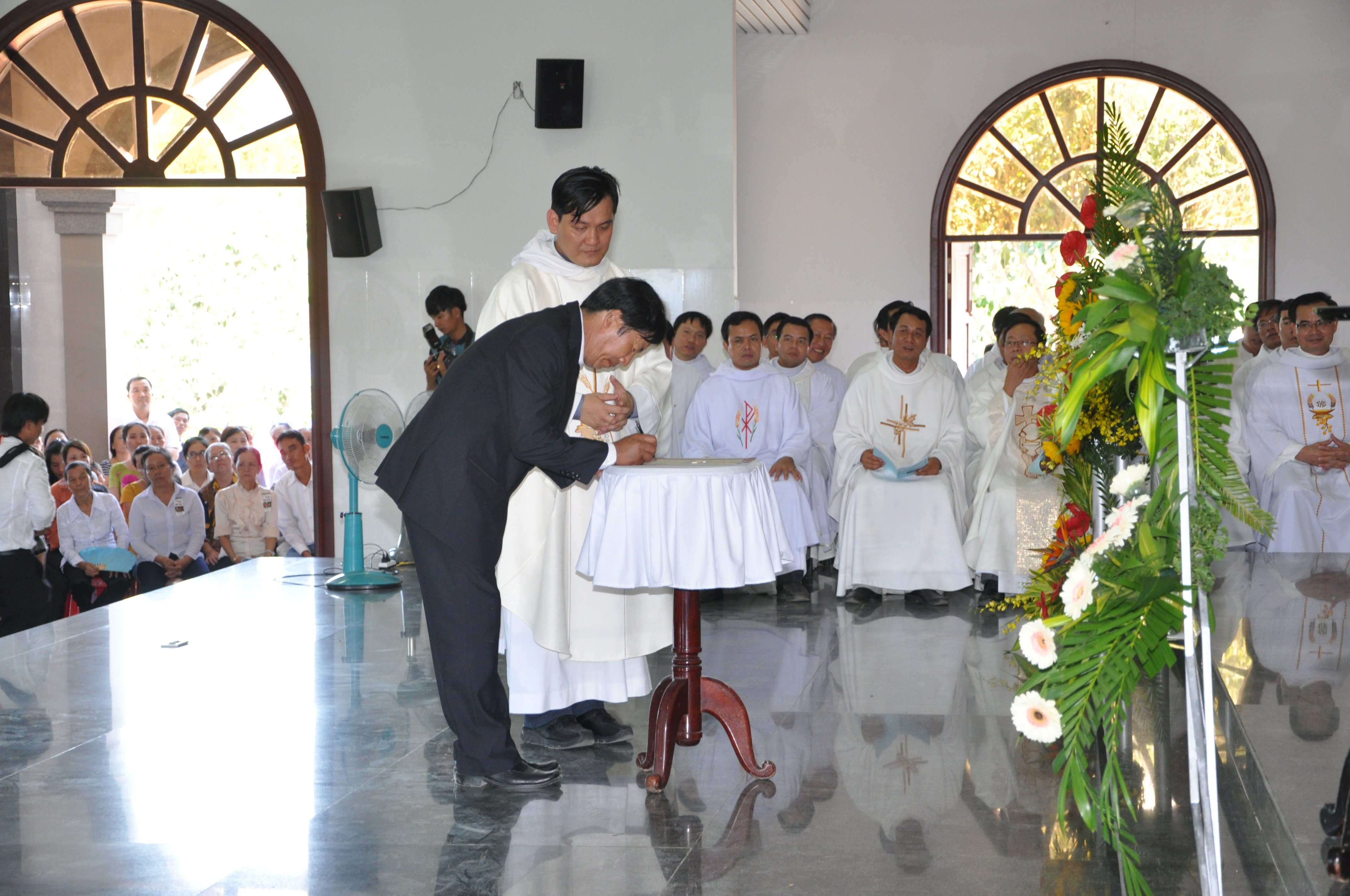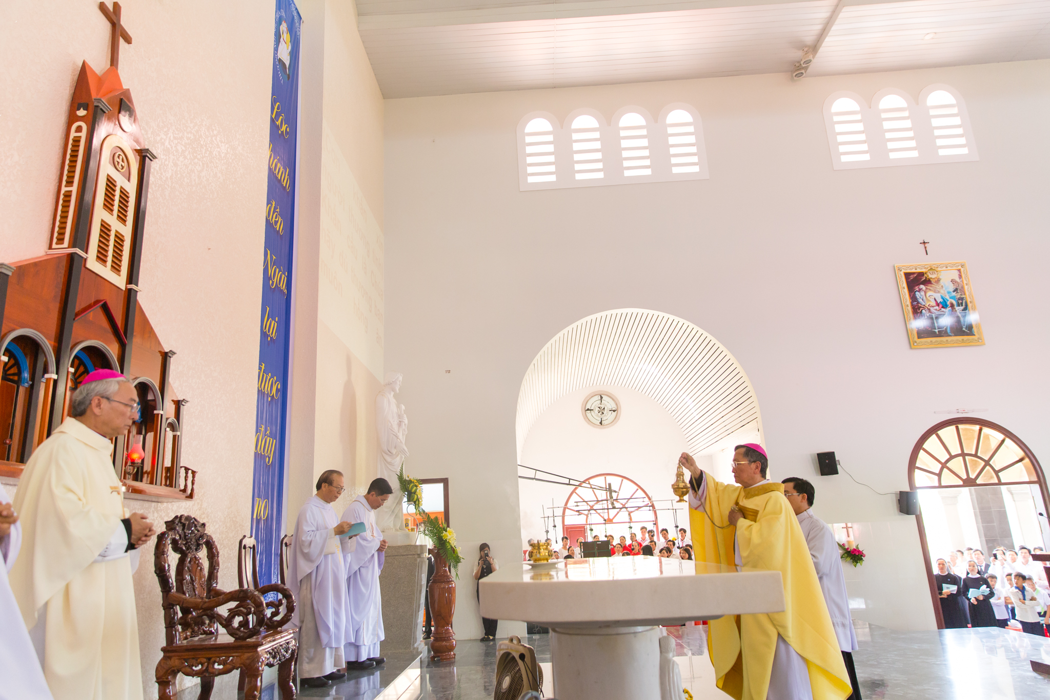Tiếp theo, Đức Cha Giáo phận long trọng đọc lời nguyện cung hiến, xin Chúa Thánh Thần thánh hóa nhà thờ và bàn thờ. Sau đó, Đức Cha xức dầu thánh và xông hương bàn thờ mới, xức dầu thánh và xông hương các thánh giá trên tường nhà thờ, thắp nến sáng bàn thờ để xin Thiên Chúa ban muôn ân phúc dư tràn xuống trên tất cả những ai đến tham dự các nghi thức phụng vụ và tôn thờ Thiên Chúa.