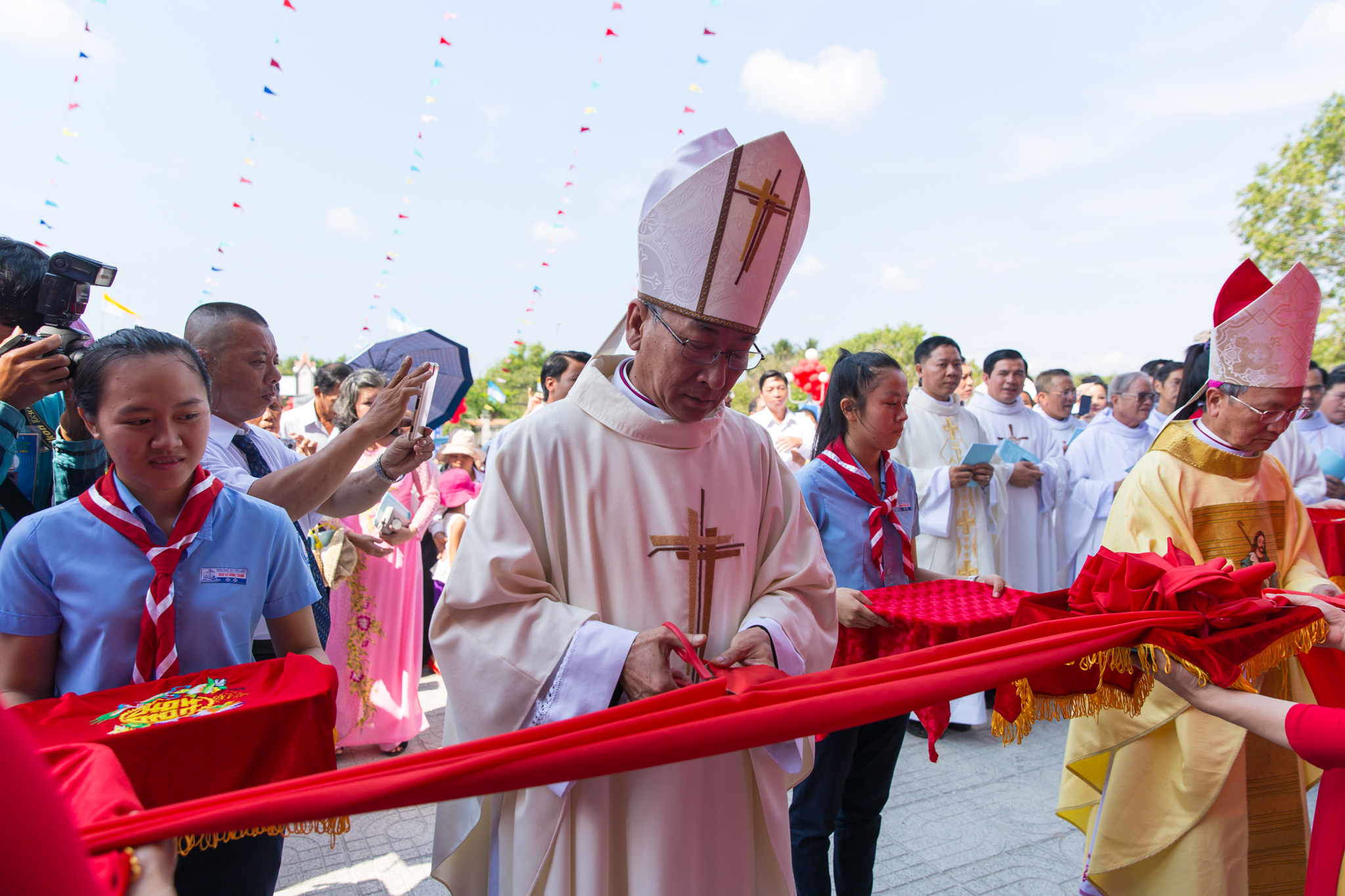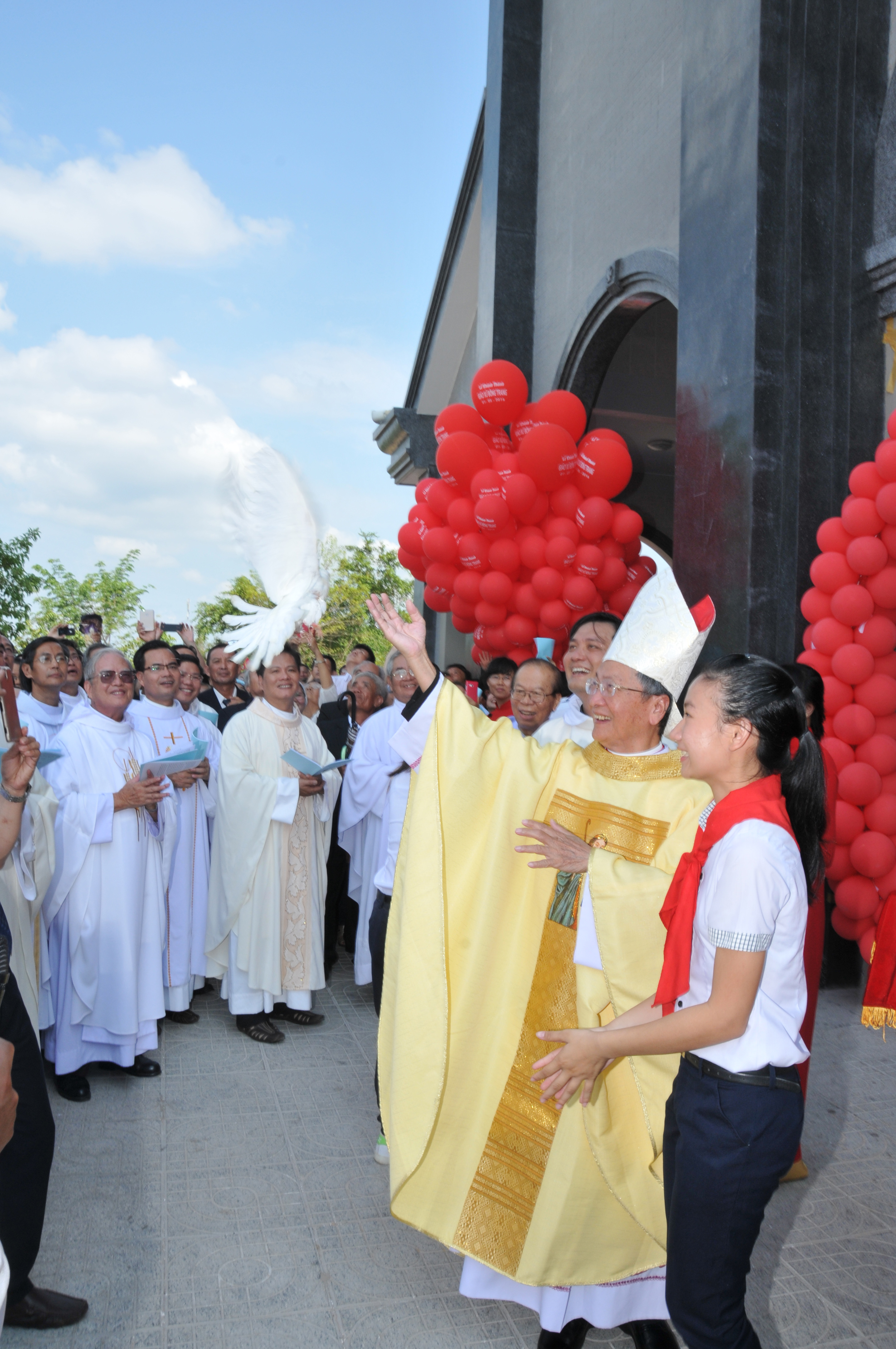 Đúng 09 giờ 00, đoàn đồng tế đã dừng lại tại tiền sảnh nhà thờ để tham dự Nghi thức Cắt băng khánh thành và Mở cửa thánh đường. Trước khi đoàn đồng tế cùng cộng đoàn tiến vào Nhà Chúa cùng dâng lời tôn vinh và tạ ơn Thiên Chúa, Đức Cha Giáo phận thả chim bồ câu, biểu tượng của Chúa Thánh Thần tung bay trên bầu trời Giáo xứ. Việc thả chim bồ câu còn nhắc nhớ sứ vụ của mỗi người là “vị sứ giả của hòa bình”.