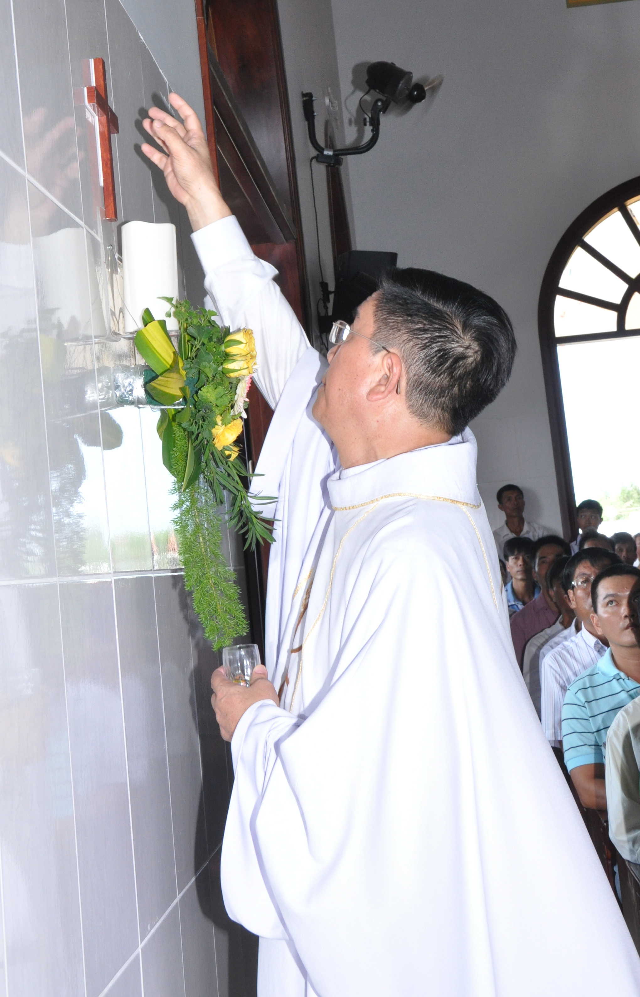 Sau đó, Đức Cha chủ tế đã chủ sự Nghi thức làm phép nước, rảy nước thánh thanh tẩy ngôi nhà thờ và bàn thờ mới.