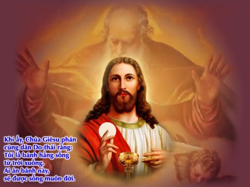 Khi ấy, đám đông thưa Chúa Giêsu: “Ngài sẽ làm dấu lạ gì để chúng tôi thấy mà tin Ngài? Ngài làm được việc gì? Cha ông chúng tôi đã ăn manna trong sa mạc, như đã chép rằng: “Người đã ban cho họ ăn bánh bởi trời”. Chúa Giêsu đáp: “Thật Ta bảo thật các ngươi, không phải Môsê đã ban cho các ngươi bánh bởi trời, mà chính Cha Ta mới ban cho các ngươi bánh bởi trời đích thực. Vì bánh của Thiên Chúa phải là vật tự trời xuống, và ban sự sống cho thế gian”. Họ liền thưa với Ngài rằng: “Thưa Ngài, xin cho chúng tôi bánh đó luôn mãi”. Chúa Giêsu nói: “Chính Ta là bánh ban sự sống. Ai đến với Ta sẽ không hề đói; ai tin vào Ta sẽ không hề khát bao giờ”.