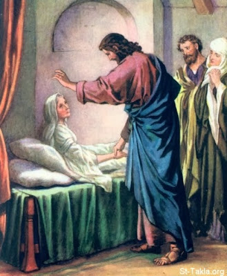 Đức Giêsu đã lại gần giường bà nằm, cầm lấy tay bà và nâng bà dậy.