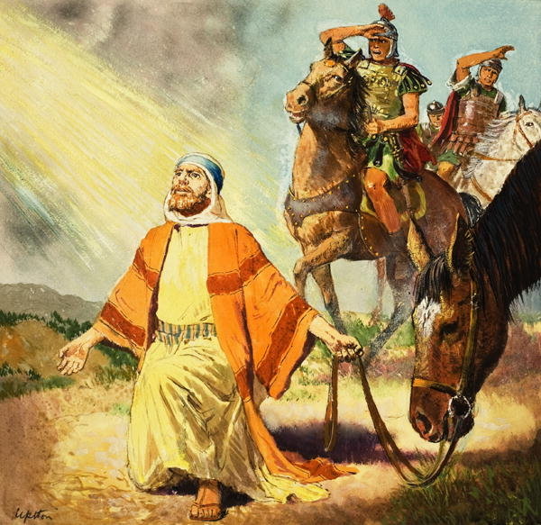 ngã ngựa, mù lòa, nghe và gặp Đức Kitô, rồi hoán cải.