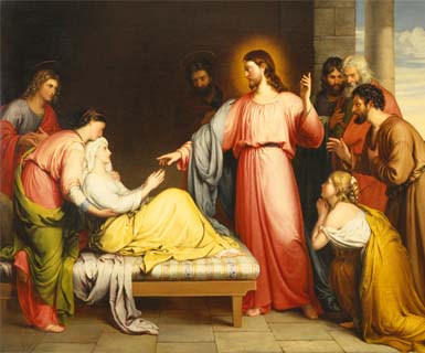 Đức Giêsu đã lại gần giường bà nằm, cầm lấy tay bà và nâng bà dậy.