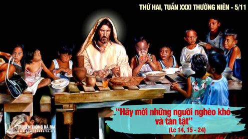 Trong đoạn Tin Mừng thánh Luca hôm nay, Chúa Giê-su đã dùng việc mời khách dự tiệc để dạy bài học phục vụ vô vị lợi, đó là: “Hãy mời những người nghèo khó, tàn tật, què quặt, đui mù”. Chúa Giê-su dùng ba hạng người “tàn tật, què quặt và đui mù” để diễn tả những con người nghèo nhất, vì họ thường bị khinh miệt nhất và không được phép tham dự những lễ nghi trong Đền thờ (2Sm 5,8; Lv 21,18).