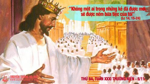 Khi ấy, một người đồng bàn thưa cùng Chúa Giêsu rằng: “Phúc cho kẻ sẽ được ăn tiệc trong nước Thiên Chúa”. Người phán cùng kẻ ấy rằng: “Có một người kia dọn tiệc linh đình, và đã mời nhiều thực khách. Tới giờ dự tiệc, ông sai đầy tớ đi báo cho những kẻ được mời để họ đến, vì mọi sự đã dọn sẵn sàng rồi. Nhưng mọi người đồng thanh xin kiếu. Người thứ nhất nói với ông rằng: ‘Tôi mới tậu một thửa ruộng, tôi cần phải đi xem đất, nên xin ông cho tôi kiếu’. Người thứ hai nói: ‘Tôi mới mua năm đôi bò, và tôi phải đi thử chúng, nên xin ông cho tôi kiếu’. Người khác lại rằng: ‘Tôi mới cưới vợ, bởi đó tôi không thể đến được’.