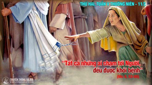 Khi ấy, Chúa Giêsu và các môn đệ qua biển rồi, các ngài tới miền Giênêsarét và ghé bến. Các ngài lên khỏi thuyền, tức thì người ta nhận ra Người, họ liền rảo chạy khắp miền, và nghe tin Người ở đâu thì khiêng những người đau yếu nằm trên chõng đến đó. Bất cứ Người vào làng trại hay đô thị nào, người ta cũng đặt các bệnh nhân ở các nơi công cộng và xin Người cho họ ít là được chạm tới gấu áo Người, và tất cả những ai chạm tới Người, đều được khỏi bệnh.