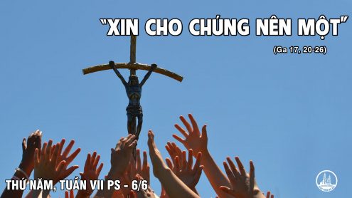 Khi ấy, Chúa Giêsu ngước mắt lên trời cầu nguyện rằng: “Lạy Cha chí thánh, Con không cầu xin cho chúng mà thôi, nhưng còn cho tất cả những kẻ, nhờ lời chúng mà tin vào Con, để mọi người nên một, cũng như Cha ở trong Con và Con ở trong Cha, để cả chúng cũng nên một trong Ta, để thế gian tin rằng Cha đã sai Con. Con đã ban cho chúng vinh hiển mà Cha đã ban cho Con, để chúng nên một như Chúng Ta là một. Con ở trong chúng, và Cha ở trong Con, để chúng được hoàn toàn nên một và để thế gian biết rằng Cha đã sai Con, và Con đã yêu mến chúng như Cha đã yêu mến Con. Lạy Cha, những kẻ Cha ban cho Con thì Con muốn rằng Con ở đâu, chúng cũng ở đấy với Con, để chúng chiêm ngưỡng vinh quang mà Cha đã ban cho Con, vì Cha đã yêu mến Con trước khi tạo thành thế gian. Lạy Cha công chính, thế gian đã không biết Cha, nhưng Con biết Cha, và những người này cũng biết rằng Cha đã sai Con. Con đã tỏ cho chúng biết danh Cha, và Con sẽ còn tỏ cho chúng nữa, để tình Cha yêu Con ở trong chúng, và Con cũng ở trong chúng nữa”.