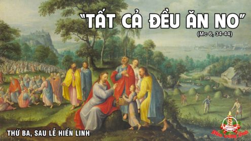 Khi ấy, Chúa Giêsu xem thấy dân chúng đông đảo thì động lòng thương xót họ, vì họ như chiên không người chăn giữ, và Người bắt đầu giảng dạy họ nhiều điều. Và khi giờ đã muộn, các môn đệ đến thưa Người rằng: “Chỗ này hoang vắng, mà giờ đã muộn, xin Thầy giải tán họ, để họ đi tới các làng các xóm gần đây mà mua gì ăn”. Chúa Giêsu trả lời họ rằng: “Các con hãy cho họ ăn đi”. Họ thưa Người: “Chúng con phải đi mua đến hai trăm đồng bạc bánh để phát cho họ ăn”. Người nói với họ: “Các con có mấy cái bánh? Hãy đi xem”. Khi biết được rồi, họ thưa: “Có năm cái bánh và hai con cá”. Người ra lệnh cho họ bảo mọi người ngồi xuống làm thành từng nhóm trên cỏ xanh. Họ ngồi xuống từng nhóm, chỗ một trăm, chỗ năm mươi. Người cầm năm cái bánh và hai con cá, ngước mắt lên trời mà chúc tụng, rồi bẻ bánh ra và trao cho các môn đệ, để họ phân phát cho người ta; còn hai con cá, Người cũng chia cho mọi người. Và tất cả đều ăn no. Mụn bánh và cá còn dư lại, người ta lượm được mười hai thúng đầy. Mà số người ăn là năm ngàn người.