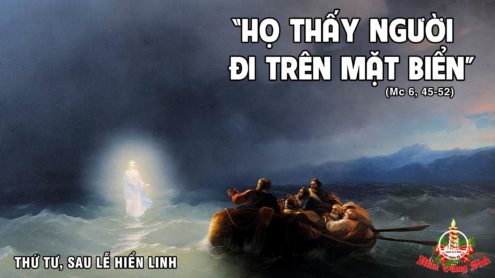 Khi ấy, Ðức Giêsu bắt các môn đệ xuống thuyền qua bờ bên kia về phía thành Bétxaiđa trước, trong lúc Người giải tán đám đông. Sau khi từ biệt các ông, Người lên núi cầu nguyện. Chiều đến, chiếc thuyền đang ở giữa biển hồ, chỉ còn một mình Người ở trên đất. Người thấy các ông phải vất vả chèo chống vì gió ngược, nên vào khoảng canh tư đêm ấy, Người đi trên mặt biển mà đến với các ông và Người định vượt các ông. Nhưng khi các ông thấy Người đi trên mặt biển, lại tưởng là ma, thì la lên. Quả thế, tất cả các ông đều nhìn thấy Người và đều hoảng hốt. Lập tức, Người bảo các ông: “Cứ yên tâm, chính Thầy đây, đừng sợ!” Người lên thuyền với các ông, và gió lặng. Các ông cảm thấy bàng hoàng sửng sốt, vì các ông đã không hiểu ý nghĩa phép lạ bánh hoá nhiều: lòng trí các ông còn ngu muội!