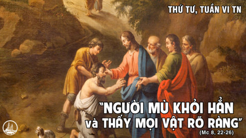 Khi ấy, Chúa Giêsu và các môn đệ đến Bếtsaiđa, người ta dẫn tới Chúa một người mù và xin Chúa đặt tay trên người ấy. Chúa cầm tay người mù, dắt ra khỏi làng, Chúa phun nước miếng vào mắt anh và đặt tay trên anh mà hỏi: “Ngươi có thấy gì không?” Anh nhìn lên và trả lời: “Tôi thấy người ta như những cây cối đang đi”. Chúa lại đặt tay trên mắt người mù, anh liền thấy rõ và khỏi hẳn, thấy được mọi vật rõ ràng. Chúa Giêsu cho người ấy về nhà và căn dặn: “Ngươi hãy về nhà, và nếu có vào làng thì đừng nói với ai”.