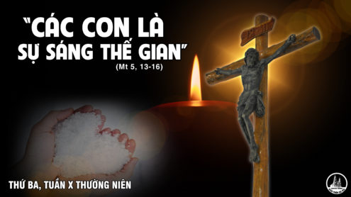 Khi ấy, Đức Giêsu nói với các môn đệ rằng: “Chính anh em là muối cho đời. Nhưng muối mà nhạt đi, thì lấy gì muối nó cho mặn lại? Nó đã thành vô dụng, thì chỉ còn việc quăng ra ngoài cho người ta chà đạp thôi. Chính anh em là ánh sáng cho trần gian. Một thành xây trên núi không tài nào che giấu được. Cũng chẳng có ai thắp đèn rồi lại để dưới cái thùng, nhưng đặt trên đế, và đèn soi chiếu cho mọi người trong nhà. Cũng vậy, ánh sáng của anh em phải chiếu giãi trước mặt thiên hạ, để họ thấy những công việc tốt đẹp anh em làm, mà tôn vinh Cha của anh em, Đấng ngự trên trời.”