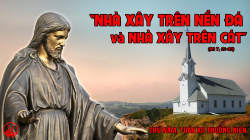 Khi ấy, Đức Giêsu nói với các môn đệ rằng: “Không phải bất cứ ai thưa với Thầy: ‘Lạy Chúa! lạy Chúa!’ là được vào Nước Trời cả đâu! Nhưng chỉ ai thi hành ý muốn của Cha Thầy là Đấng ngự trên trời, mới được vào mà thôi. Trong ngày ấy, nhiều người sẽ thưa với Thầy rằng: ‘Lạy Chúa, lạy Chúa, nào chúng tôi đã chẳng từng nhân danh Chúa mà nói tiên tri, nhân danh Chúa mà trừ quỷ, nhân danh Chúa mà làm nhiều phép lạ đó sao?’ Và bấy giờ Thầy sẽ tuyên bố với họ: ‘Ta không hề biết các ngươi; xéo đi cho khuất mắt Ta, hỡi bọn làm điều gian ác!’ Vậy ai nghe những lời Thầy nói đây mà đem ra thực hành, thì ví được như người khôn xây nhà trên đá. Dù mưa sa, nước cuốn, hay bão táp ập vào, nhà ấy cũng không sụp đổ, vì đã xây trên nền đá. Còn ai nghe những lời Thầy nói đây, mà chẳng đem ra thực hành, thì ví được như người ngu dại xây nhà trên cát. Gặp mưa sa, nước cuốn hay bão táp ập vào, nhà ấy sẽ sụp đổ, sụp đổ tan tành.”