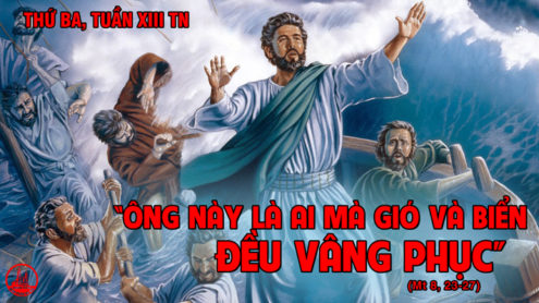 Khi ấy Đức Giêsu xuống thuyền, các môn đệ đi theo Người. Bỗng nhiên biển động mạnh khiến sóng ập vào thuyền, nhưng Người vẫn ngủ. Các ông lại gần đánh thức Người và nói: “Thưa Ngài, xin cứu chúng con, chúng con chết mất!” Đức Giêsu nói: “Sao nhát thế, hỡi những người kém lòng tin!” Rồi Người trỗi dậy, ngăm đe gió và biển: biển liền lặng như tờ. Người ta ngạc nhiên và nói: “Ông này là người thế nào mà cả đến gió và biển cũng tuân lệnh?”