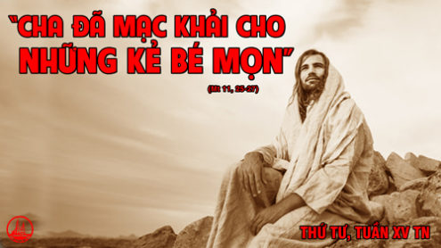 Khi ấy, Ðức Giêsu cất tiếng nói: “Lạy Cha là Chúa Tể trời đất, con xin ngợi khen Cha, vì Cha đã giấu không cho bậc khôn ngoan thông thái biết những điều này, nhưng lại mặc khải cho những người bé mọn. Vâng, lạy Cha, vì đó là điều đẹp ý Cha. Cha tôi đã giao phó mọi sự cho tôi. Và không ai biết Người Con, trừ Chúa Cha; cũng như không biết Chúa Cha, trừ Người Con và kẻ mà Người Con muốn mặc khải cho.”