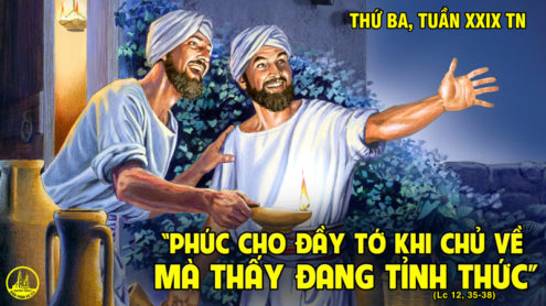 Khi ấy, Đức Giêsu nói với các môn đệ rằng: “Anh em hãy thắt lưng cho gọn, thắp đèn cho sẵn. Hãy làm như những người đợi chủ đi ăn cưới về, để khi chủ vừa về tới và gõ cửa, là mở ngay. Khi chủ về mà thấy những đầy tớ ấy đang tỉnh thức, thì thật là phúc cho họ. Thầy bảo thật anh em: chủ sẽ thắt lưng, đưa họ vào bàn ăn, và đến bên từng người mà phục vụ. Nếu canh hai hoặc canh ba ông chủ mới về, mà còn thấy họ tỉnh thức như vậy, thì thật là phúc cho họ.”