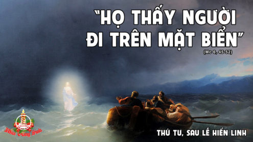 Khi ấy, Ðức Giêsu bắt các môn đệ xuống thuyền qua bờ bên kia về phía thành Bétxaiđa trước, trong lúc Người giải tán đám đông. Sau khi từ biệt các ông, Người lên núi cầu nguyện. Chiều đến, chiếc thuyền đang ở giữa biển hồ, chỉ còn một mình Người ở trên đất. Người thấy các ông phải vất vả chèo chống vì gió ngược, nên vào khoảng canh tư đêm ấy, Người đi trên mặt biển mà đến với các ông và Người định vượt các ông. Nhưng khi các ông thấy Người đi trên mặt biển, lại tưởng là ma, thì la lên. Quả thế, tất cả các ông đều nhìn thấy Người và đều hoảng hốt. Lập tức, Người bảo các ông: “Cứ yên tâm, chính Thầy đây, đừng sợ!” Người lên thuyền với các ông, và gió lặng. Các ông cảm thấy bàng hoàng sửng sốt, vì các ông đã không hiểu ý nghĩa phép lạ bánh hoá nhiều: lòng trí các ông còn ngu muội!