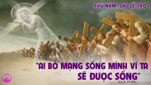Khi ấy Đức Giêsu nói với các môn đệ rằng: “Con Người phải chịu đau khổ nhiều, bị các kỳ mục, thượng tế cùng kinh sư loại bỏ, bị giết chết, và ngày thứ ba sống lại.”Rồi Ðức Giêsu nói với mọi người: “Ai muốn theo tôi, phải từ bỏ chính mình, vác thập giá mình hằng ngày mà theo. Quả vậy, ai muốn cứu mạng sống mình, thì sẽ mất; còn ai liều mất mạng sống mình vì tôi, thì sẽ cứu được mạng sống ấy. Vì người nào được cả thế giới mà phải đánh mất chính mình hay là thiệt thân, thì nào có lợi gì? Ai xấu hổ vì tôi và những lời của tôi, thì Con Người cũng sẽ xấu hổ vì kẻ ấy, khi Người ngự đến trong vinh quang của mình, của Chúa Cha và các thánh thiên thần.”