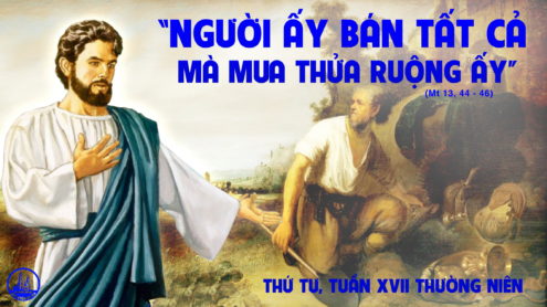 Hôm ấy, Ðức Giêsu nói với dân chúng dụ ngôn này: “Nước Trời giống như chuyện kho báu chôn giấu trong ruộng. Có người kia gặp được thì liền chôn giấu lại, rồi vui mừng đi bán tất cả những gì mình có mà mua thửa ruộng ấy. Nước Trời lại cũng giống như chuyện một thương gia đi tìm ngọc đẹp. Tìm được một viên ngọc quý, ông ta ra đi, bán tất cả những gì mình có mà mua viên ngọc ấy.”