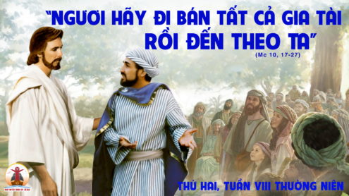 “Đức Giê-su đưa mắt nhìn anh ta và đem lòng yêu mến. Người bảo anh ta: “Anh chỉ thiếu có một điều, là hãy đi bán những gì anh có mà cho người nghèo, anh sẽ được một kho tàng trên trời. Rồi hãy đến theo tôi.” Nghe lời đó, anh ta sa sầm nét mặt và buồn rầu bỏ đi, vì anh ta có nhiều của cải”. (Mc 10,21-22)