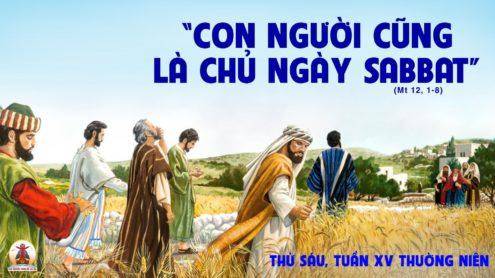 Khi ấy, vào ngày Sabát, Ðức Giêsu băng qua một cánh đồng lúa; các môn đệ thấy đói và bắt đầu bứt lúa ăn. Những người Pharisêu thấy vậy, mới nói với Ðức Giêsu: “Ông coi, các môn đệ ông làm điều không được phép làm ngày sabát!” Người đáp: “Các ông chưa đọc trong Sách à? Vua Ðavít đã làm gì, khi vua và thuộc hạ đói bụng? Vua vào nhà Thiên Chúa, và đã cùng thuộc hạ ăn bánh tiến. Thứ bánh này, họ không được phép ăn, chỉ có tư tế mới được ăn mà thôi. Hay các ông chưa đọc trong sách Luật rằng ngày sabát, các tư tế trong Ðền Thờ vi phạm luật sabát mà không mắc tội đó sao? Tôi nói cho các ông hay: ở đây còn lớn hơn Ðền Thờ nữa. Nếu các ông hiểu được ý nghĩa của câu này: Ta muốn lòng nhân, chứ đâu cần lễ tế, ắt các ông đã chẳng lên án kẻ vô tội. Quả thế, Con Người làm chủ ngày sabát.”