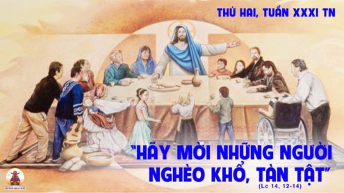 Khi ấy Ðức Giêsu nói với kẻ đã mời Người rằng: “Khi nào ông đãi khách ăn trưa hay ăn tối, thì đừng kêu bạn bè, anh em, hay bà con, hoặc láng giềng giàu có, kẻo họ cũng mời lại ông, và như thế ông được đáp lễ rồi. Trái lại, khi ông đãi tiệc, hãy mời những người nghèo khó, tàn tật, què quặt, đui mù. Họ không có gì đáp lễ, và như thế, ông mới thật có phúc: vì ông sẽ được đáp lễ trong ngày các kẻ lành sống lại”.