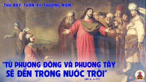 Đức Giêsu nghĩ đến ngày cánh chung, quanh bàn tiệc Nước Trời, có bao người đến từ muôn phương, những kẻ không phải là người Do thái. Họ làm nên một cộng đoàn mới gồm những kẻ tin vào Ngài. Họ vui sướng được ngồi bên các tổ phụ và những người Ítraen chân chính. Đức Giêsu cho thấy dòng lịch sử đang đi vào ngã rẽ quan trọng. Ơn cứu độ phổ quát do Ngài đem lại được mở ra cho mọi người. Chỉ ai cố tình chối từ Tin Mừng Nước Trời mới bị loại (c. 12). Đức Giêsu không chỉ rao giảng Nước Trời bằng lời. Ngài còn chứng minh Nước Trời đã đến bằng bao việc tốt lành, kỳ diệu. Lời Ngài giảng cũng là lời chữa cho người phong, cho tên đầy tớ. “Ngài nói một lời là trừ được các thần dữ” (c. 16). Lời uy quyền khi giảng cũng là lời uy quyền khi chữa bệnh. Nhưng Đức Giêsu cũng đụng chạm đến nỗi đau của con người. Ngài đụng đến người phong, và đụng đến bàn tay mẹ vợ ông Phêrô (c. 15). Hôm nay, Giáo Hội vẫn cần những người rao giảng như Giêsu.