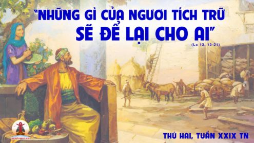 Ông chợt nhận ra mình phải bỏ lại tất cả. Cái kho không níu được ông, cũng không vững như ông nghĩ. Những gì ông thu tích như giọt nước lọt qua kẽ tay. Ai trong chúng ta cũng có một hay nhiều kho. Có thể chúng ta ôm mộng làm giàu hay đang giàu lên, chúng ta định nới kho cũ hay xây kho mới. Chúng ta chăm chút cái kho cho con cháu mai này. Thật ra của cải không xấu, xây kho cũng không xấu. “Nhưng phải giữ mình khỏi mọi thứ tham lam” (12,15). Phải mở rộng những cánh cửa kho của mình, để kho không phải chỉ là nơi tích trữ cho tôi, nhưng là phương tiện để tôi giúp đỡ tha nhân. Ðừng để nhà kho, két sắt, ví tiền thành mục đích. Người giàu đáng yêu trước mặt Thiên Chúa là người biết mở kho để trao đi và thấy Thiên Chúa liên tục làm cho kho mình đầy lại. Làm thế nào để khi ra trước toà Chúa, chúng ta thấy kho của mình trống trơn vì vừa mới cho đi tất cả.