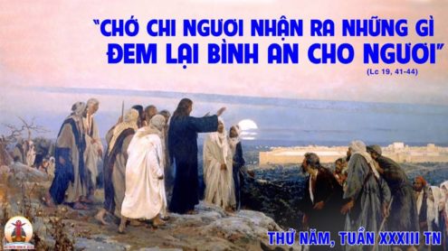 Khi ấy, Chúa Giêsu đến gần Giêrusalem, trông thấy thành thì Người khóc thương thành ấy mà rằng: “Chớ chi hôm nay ngươi hiểu biết sứ điệp mang hoà bình lại cho ngươi! Nhưng giờ đây, sứ điệp ấy bị che khuất khỏi mắt ngươi. Vì sẽ đến ngày quân thù đắp luỹ bao vây ngươi, xiết chặt ngươi tứ bề. Chúng sẽ tàn phá ngươi bình địa, ngươi cùng con cái ở trong thành. Chúng sẽ không để lại hòn đá nào trên hòn đá nào, vì ngươi đã không nhận biết giờ ngươi được thăm viếng”.