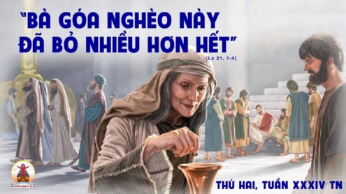Khi ấy, Chúa Giêsu nhìn lên, thấy những người giàu có bỏ tiền dâng cúng vào hòm tiền. Người cũng thấy một bà goá nghèo khó bỏ vào đó hai đồng tiền nhỏ, nên bảo rằng: “Thầy bảo thật các con, bà goá nghèo khó này đã bỏ vào hòm tiền nhiều hơn mọi người. Vì mọi người kia lấy của dư thừa mà dâng cho Thiên Chúa, còn bà này túng thiếu, bà đã dâng tất cả những gì bà có để nuôi sống mình”.