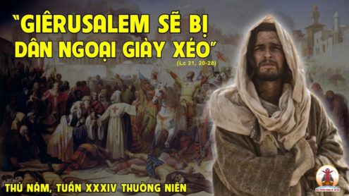 Khi ấy, Chúa Giêsu phán cùng các môn đệ rằng: “Khi các con thấy Giêrusalem bị các đạo binh bao vây, các con hãy biết rằng đã gần đến lúc thành ấy bị tàn phá. Bấy giờ những ai ở trong đất Giuđa, hãy chạy trốn lên núi, những ai ở trong thành, hãy rời xa, và những ai ở vùng quê, chớ có vào thành; vì những ngày ấy là những ngày báo oán, để ứng nghiệm mọi lời đã ghi chép. Khốn cho những đàn bà đang mang thai và nuôi con thơ trong những ngày ấy: vì chưng sẽ có sự khốn cực cả thể trong xứ và cơn thịnh nộ trút xuống dân này. Chúng sẽ ngã gục dưới lưỡi gươm, sẽ phải bắt đi làm tôi trong các dân, và Giêrusalem sẽ bị các dân ngoại chà đạp, cho đến thời kỳ dành cho dân ngoại chấm dứt. Sẽ có những điềm lạ trên mặt trời, mặt trăng và các ngôi sao; dưới đất, các dân tộc buồn sầu lo lắng, vì biển gầm sóng vỗ. Người ta sợ hãi kinh hồn, chờ đợi những gì sẽ xảy đến trong vũ trụ, vì các tầng trời sẽ rung chuyển. Lúc đó, người ta sẽ thấy trên đám mây, Con Người hiện đến đầy quyền năng và uy nghi cao cả. Khi những điều đó bắt đầu xảy đến, các con hãy đứng dậy và ngẩng đầu lên, vì giờ cứu rỗi các con đã gần đến”.