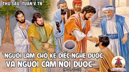 Khi ấy, Chúa Giêsu từ địa hạt Tyrô, qua Siđon đến gần biển Galilêa giữa miền thập tỉnh. Người ta đem đến cho Người một kẻ điếc và xin Người đặt tay trên kẻ ấy. Người đem anh ta ra khỏi đám đông, đặt ngón tay vào tai anh và bôi nước miếng vào lưỡi anh. Ðoạn ngước mắt lên trời, Người thở dài và bảo: Ephata, nghĩa là “hãy mở ra”, tức thì tai anh được sõi sàng. Chúa Giêsu liền cấm họ: đừng nói điều đó với ai cả. Nhưng Người càng cấm, thì họ càng loan truyền mạnh hơn. Họ đầy lòng thán phục, mà rằng: “Người làm mọi sự tốt đẹp, Người làm cho kẻ điếc nghe được và người câm nói được”.