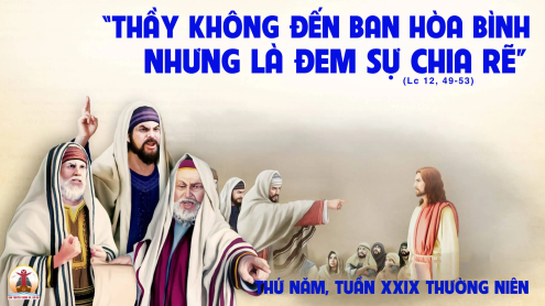 Khi ấy, Chúa Giêsu phán cùng các môn đệ rằng: “Thầy đã đến đem lửa xuống thế gian, và Thầy mong muốn biết bao cho lửa cháy lên. Thầy phải chịu một phép rửa, và lòng Thầy khắc khoải biết bao cho đến khi hoàn tất. Các con tưởng Thầy đến để đem sự bình an xuống thế gian ư? Thầy bảo các con: không phải thế, nhưng Thầy đến để đem sự chia rẽ. Vì từ nay, năm người trong một nhà sẽ chia rẽ nhau, ba người chống lại hai, và hai người chống lại ba: cha chống đối con trai, và con trai chống đối cha; mẹ chống đối con gái, và con gái chống đối mẹ; mẹ chồng chống đối nàng dâu, và nàng dâu chống đối mẹ chồng”.