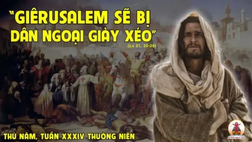Khi ấy, Chúa Giêsu phán cùng các môn đệ rằng: “Khi các con thấy Giêrusalem bị các đạo binh bao vây, các con hãy biết rằng đã gần đến lúc thành ấy bị tàn phá. Bấy giờ những ai ở trong đất Giuđa, hãy chạy trốn lên núi, những ai ở trong thành, hãy rời xa, và những ai ở vùng quê, chớ có vào thành; vì những ngày ấy là những ngày báo oán, để ứng nghiệm mọi lời đã ghi chép. Khốn cho những đàn bà đang mang thai và nuôi con thơ trong những ngày ấy: vì chưng sẽ có sự khốn cực cả thể trong xứ và cơn thịnh nộ trút xuống dân này. Chúng sẽ ngã gục dưới lưỡi gươm, sẽ phải bắt đi làm tôi trong các dân, và Giêrusalem sẽ bị các dân ngoại chà đạp, cho đến thời kỳ dành cho dân ngoại chấm dứt. Sẽ có những điềm lạ trên mặt trời, mặt trăng và các ngôi sao; dưới đất, các dân tộc buồn sầu lo lắng, vì biển gầm sóng vỗ. Người ta sợ hãi kinh hồn, chờ đợi những gì sẽ xảy đến trong vũ trụ, vì các tầng trời sẽ rung chuyển. Lúc đó, người ta sẽ thấy trên đám mây, Con Người hiện đến đầy quyền năng và uy nghi cao cả. Khi những điều đó bắt đầu xảy đến, các con hãy đứng dậy và ngẩng đầu lên, vì giờ cứu rỗi các con đã gần đến”. Ðó là lời Chúa.