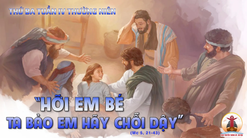 Khi ấy, Chúa Giêsu đã xuống thuyền trở về bờ bên kia, có đám đông dân chúng tụ họp quanh Người, và lúc đó Người đang ở bờ biển. Bỗng có một ông trưởng hội đường tên là Giairô đến. Trông thấy Người, ông sụp lạy và van xin rằng: “Con gái tôi đang hấp hối, xin Ngài đến đặt tay trên nó để nó được khỏi và được sống”. Chúa Giêsu ra đi với ông ấy, và đám đông dân chúng cũng đi theo chen lấn Người tứ phía. Vậy có một người đàn bà bị bệnh xuất huyết đã mười hai năm. Bà đã chịu cực khổ, tìm thầy chạy thuốc, tiêu hết tiền của mà không thuyên giảm, trái lại bệnh càng tệ hơn. Khi bà nghe nói về Chúa Giêsu, bà đi lẫn trong đám đông đến phía sau Người, chạm đến áo Người, vì bà tự nhủ: “Miễn sao tôi chạm tới áo Người thì tôi sẽ được lành”. Lập tức, huyết cầm lại và bà cảm thấy trong mình đã được khỏi bệnh. Ngay lúc ấy, Chúa Giêsu nhận biết có sức mạnh đã xuất phát tự mình, Người liền quay lại đám đông mà hỏi: “Ai đã chạm đến áo Ta?” Các môn đệ thưa Người rằng: “Thầy coi, đám đông chen lấn Thầy tứ phía, vậy mà Thầy còn hỏi “Ai chạm đến Ta?” Nhưng Người cứ nhìn quanh để tìm xem kẻ đã làm điều đó. Bấy giờ người đàn bà run sợ, vì biết rõ sự thể đã xảy ra nơi mình, liền đến sụp lạy Người và thú nhận với Người tất cả sự thật. Người bảo bà: “Hỡi con, đức tin con đã chữa con, hãy về bình an và được khỏi bệnh”. Người còn đang nói, thì người nhà đến nói với ông trưởng hội đường rằng: “Con gái ông chết rồi, còn phiền Thầy làm chi nữa?” Nhưng Chúa Giêsu đã thoáng nghe lời họ vừa nói, nên Người bảo ông trưởng hội đường rằng: “Ông đừng sợ, hãy cứ tin”. Và Người không cho ai đi theo, trừ Phêrô, Giacôbê và Gioan, em Giacôbê. Các ngài đến nhà ông trưởng hội đường. Và Chúa Giêsu thấy người ta khóc lóc kêu la ồn ào, Người bước vào và bảo họ: “Sao ồn ào và khóc lóc thế? Con bé không chết đâu, nó đang ngủ đó”. Họ liền chế diễu Người. Nhưng Người đuổi họ ra ngoài hết, chỉ đem theo cha mẹ đứa bé và những môn đệ đã theo Người vào chỗ đứa bé nằm. Và Người cầm tay đứa nhỏ nói rằng: “Talitha, Koumi!”, nghĩa là: “Hỡi em bé, Ta truyền cho em hãy chỗi dậy!” Tức thì em bé đứng dậy và đi được ngay, vì em đã được mười hai tuổi. Họ sửng sốt kinh ngạc. Nhưng Người cấm ngặt họ đừng cho ai biết việc ấy, và bảo họ cho em bé ăn. Ðó là lời Chúa.
