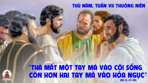 “Nếu tay con nên dịp tội cho con, hãy chặt tay đó đi: thà con mất một tay mà được vào cõi sống, còn hơn là có đủ hai tay mà phải vào hoả ngục, trong lửa không hề tắt. Và nếu chân con làm dịp tội cho con, hãy chặt chân đó đi: thà con mất một chân mà được vào cõi sống, còn hơn là có đủ hai chân mà phải ném xuống hoả ngục. Và nếu mắt con làm dịp tội cho con, hãy móc mắt đó đi, thà con còn một mắt mà vào nước Thiên Chúa, còn hơn là có đủ hai mắt mà phải ném xuống hoả ngục, nơi mà dòi bọ rúc rỉa nó không hề chết và lửa không hề tắt. Vì mọi người sẽ bị ướp bằng lửa.