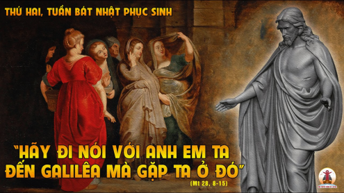 Khi ấy, các bà vội ra khỏi mồ vừa sợ lại vừa hớn hở vui mừng, chạy báo tin cho các môn đệ Chúa. Và này Chúa Giêsu đón gặp các bà, Người nói: “Chào các bà”. Các bà liền lại gần ôm chân Người và phục lạy. Bấy giờ Chúa Giêsu bảo: “Các bà đừng sợ. Hãy đi báo tin cho các anh em Ta phải trở về Galilêa, rồi ở đó họ sẽ gặp Ta”.