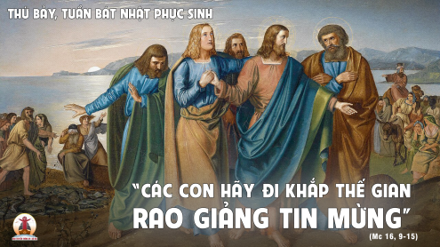 Khi Chúa Giêsu sống lại, sáng sớm ngày thứ nhất trong tuần, thì trước hết Người hiện ra với Maria Mađalêna, kẻ đã được Chúa đuổi bảy quỷ. Bà đi báo tin cho những kẻ đã từng ở với Người và nay đang buồn thảm khóc lóc. Họ nghe bà nói Chúa sống lại và bà đã thấy Người, nhưng họ không tin. Sau đó, Chúa lại hiện ra dưới hình thức khác với hai môn đệ đang trên đường về miền quê. Hai ông trở về báo tin cho anh em, nhưng họ cũng không tin các ông ấy. Sau hết, Chúa hiện ra với mười một tông đồ lúc đang ngồi ăn. Chúa khiển trách các ông đã cứng lòng, vì các ông không tin những kẻ đã thấy Người sống lại. Rồi Người phán: “Các con hãy đi khắp thế gian rao giảng Tin Mừng cho muôn loài”. Ðó là lời Chúa.
