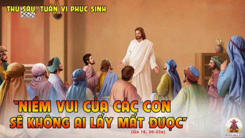 Khi ấy, Chúa Giêsu phán cùng các môn đệ rằng: “Thật, Thầy bảo thật các con: các con sẽ than van khóc lóc, còn thế gian sẽ vui mừng. Các con sẽ buồn sầu, nhưng nỗi buồn của các con sẽ trở thành niềm vui. Người đàn bà khi sinh con thì lo buồn, vì giờ đã đến, nhưng khi đã sinh con rồi, thì bà mừng rỡ, không còn nhớ đến cơn đau, bởi vì đã có một người sinh ra đời. Các con cũng thế, bây giờ các con buồn phiền, nhưng Thầy sẽ gặp lại các con, và lòng các con sẽ vui mừng, và niềm vui của các con không ai sẽ lấy mất được. Và trong ngày đó các con sẽ không còn hỏi Thầy điều gì nữa”. Ðó là lời Chúa.