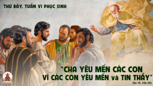 Khi ấy, Chúa Giêsu phán cùng các môn đệ rằng: “Thật, Thầy bảo thật các con: điều gì các con sẽ nhân danh Thầy mà xin Cha, thì Người sẽ ban cho các con. Cho đến bây giờ, các con chưa nhân danh Thầy mà xin điều gì. Hãy xin thì sẽ được, để các con được niềm vui trọn vẹn. Tất cả những điều đó, Thầy đã dùng dụ ngôn mà nói với các con. Ðã đến giờ Thầy sẽ không còn dùng dụ ngôn mà nói nữa, Thầy sẽ loan truyền rõ ràng cho các con về Cha. Ngày đó các con sẽ nhân danh Thầy mà xin, và Thầy không bảo là chính Thầy sẽ xin Cha cho các con đâu. Chính Cha yêu mến các con, bởi vì chúng con yêu mến Thầy và tin rằng Thầy bởi Thiên Chúa mà ra. Thầy bởi Cha mà ra, và đã đến trong thế gian, rồi bây giờ Thầy bỏ thế gian mà về cùng Cha”. Ðó là lời Chúa.