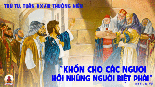 Khi ấy, Chúa phán rằng: “Khốn cho các ngươi, hỡi những người biệt phái! Vì các ngươi nộp thuế thập phân, bạc hà, vân hương, và các thứ rau, mà lại bỏ qua đức công bình và lòng yêu mến Thiên Chúa: Phải thi hành những điều này, và không được bỏ những điều kia. Khốn cho các ngươi, hỡi những người biệt phái! Vì các ngươi ưa thích ngồi ghế nhất trong các hội đường, và ưa thích được chào hỏi ngoài phố chợ. Khốn cho các ngươi, vì các ngươi giống những mồ mả không rõ rệt, người ta bước đi ở trên mà không hay biết!”