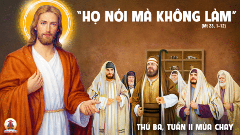 Bài Tin Mừng hôm nay được đọc trong Mùa Chay không phải để chúng ta nghiền ngẫm thói hư của một số người Pharisêu, nhưng để chúng ta soi gương họ mà nhận ra mình. Chẳng có thói đạo đức giả nào của họ mà ta được miễn nhiễm. Đạo đức giả đơn giản là một sự mâu thuẫn, thiếu thống nhất nơi lòng người. Nói rất hay, giảng rất đúng, nhưng lại chẳng sống điều mình nói hay giảng. Có một khoảng cách thật xa giữa ngôn và hành. Chất trên vai người khác gánh nặng của luật lệ với những đòi hỏi chi li, nhưng chính mình lại không muốn chia sẻ chút nào gánh nặng đó. Vẫn là khoảng cách giữa nói và làm, giữa mình với người khác. Đeo trên trán hay cánh tay những hộp kinh thật to, đính những tua áo thật dài: các cử chỉ này lẽ ra để bày tỏ tình yêu đối với Lời Chúa, qui hướng về Chúa, thì lại trở nên những cử chỉ qui về mình, nhằm làm cho người ta thấy mình, thấy sự đạo hạnh của mình, để tìm tiếng khen. Người đạo đức giả không thực sự tìm Chúa. Chúa chỉ là phương tiện để họ tự đánh bóng mình trước mặt người đời. Háo danh là điều họ khó dứt bỏ trong cuộc sống: ưa ngồi chỗ nhất, ưa chiếm ghế đầu, thích được chào là rabbi…