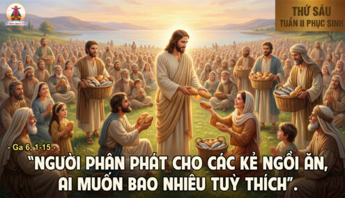 Có người coi tôn giáo như một thứ duy tâm, duy linh, chỉ để ý đến chuyện linh hồn, chuyện đời sau, mà hững hờ với cái đói cái no của thân xác, với chuyện áo cơm thường nhật. Kitô giáo hẳn không phải là thế. Đức Giêsu, Con Thiên Chúa, đã khai mở Nước Thiên Chúa trên trần gian không phải chỉ bằng việc rao giảng như một thầy dạy, mà còn bằng việc chữa bệnh thân xác như một thầy thuốc. Ơn cứu độ do Ngài mang lại có tính toàn diện, cả xác lẫn hồn, và ơn cứu độ ấy đã bắt đầu ngay từ đời này rồi. Trong Mùa Phục sinh, Giáo hội cho ta nghe đọc chương 6 của Tin Mừng Gioan, bởi lẽ chương này nói về Đức Giêsu là Bánh hằng sống, Bánh ban sự sống. Chương này khởi đầu bằng phép lạ hóa bánh ra nhiều. Phép lạ diễn ra ở bên kia hồ Galilê, vào mùa xuân, cỏ mọc xanh mướt. Đám đông đến với Đức Giêsu đang ở trên núi với các môn đệ. Tất cả bắt đầu bằng câu hỏi bất ngờ của Thầy Giêsu: “Ta mua đâu ra bánh cho họ ăn đây?” Các câu trả lời của hai ông Philípphê và Anrê thật đáng thất vọng. Hai trăm quan tiền bánh cũng chẳng đủ mỗi người một chút (c. 7).
