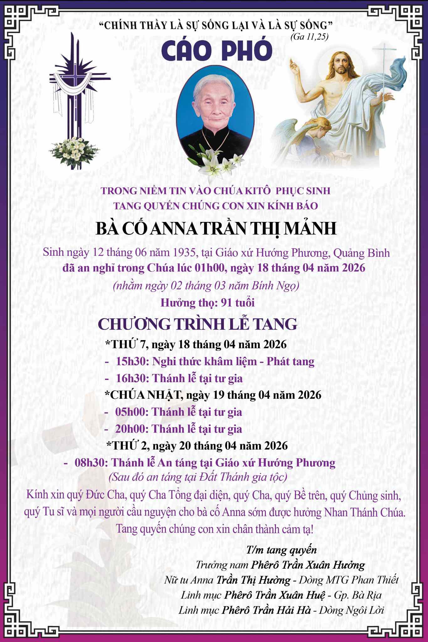 (Thân mẫu Cha Phêrô Trần Xuân Huệ – Giám đốc Chủng sinh GP. Bà Rịa) qua đời