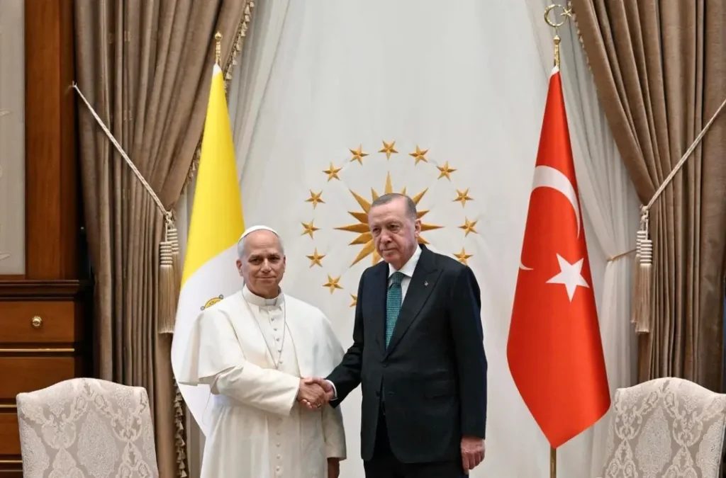 Đến 14 giờ, Đức Thánh Cha rời Lăng Atatürk để đến Dinh Tổng thống cách đó 6,6km, tại khu vực Beştepe. Công trình này, từng mang tên Ak Saray – “Cung điện Trắng”, được khánh thành năm 2014 và trở thành trung tâm quyền lực mới thay thế Cankaya. Với diện tích khoảng 300.000m² và hơn 1.150 phòng, Dinh Tổng thống kết hợp phong cách kiến trúc Seljuk với quy mô hiện đại. Đáng chú ý, nơi đây từng bị tấn công trong biến cố đảo chính bất thành năm 2016.
