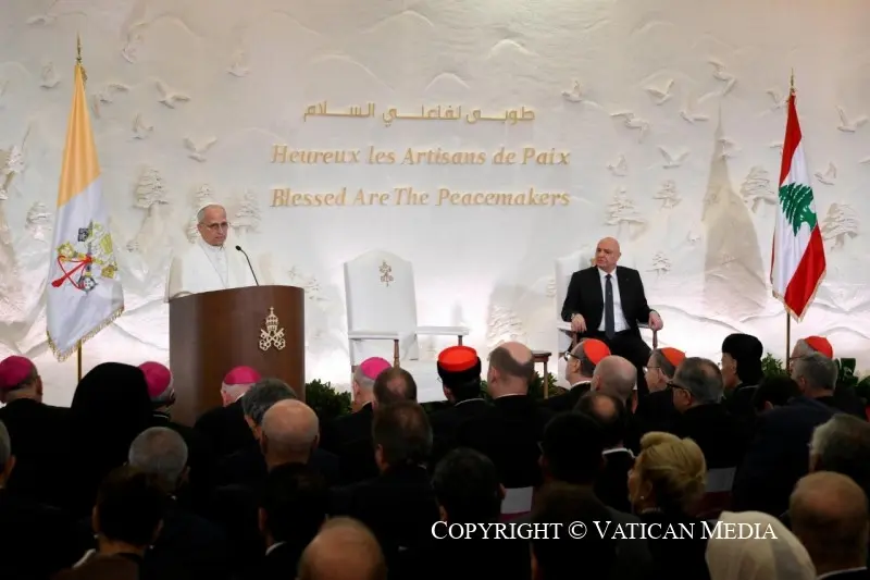 Thật là niềm vui lớn lao được gặp gỡ quý vị và thăm viếng mảnh đất này, nơi “hòa bình” không chỉ là một từ ngữ: ở đây, hòa bình là một khát vọng và là một ơn gọi, là một món quà và là một công trường luôn rộng mở. Quý vị là những người được trao trách nhiệm trong đất nước này, mỗi người trong phạm vi và vai trò cụ thể của mình. Trong cái nhìn về quyền bính ấy mà tôi muốn gửi đến quý vị lời của Chúa Giêsu – câu được chọn làm nguồn cảm hứng cho toàn bộ chuyến viếng thăm này của tôi: “Phúc thay ai xây dựng hòa bình!” (Mt 5,9). Dĩ nhiên, có hàng triệu người Libăng, ở đây cũng như trên khắp thế giới, đang âm thầm phục vụ hòa bình ngày qua ngày. Nhưng đối với quý vị, những người mang trọng trách thể chế quan trọng trong lòng dân tộc này, mối phúc đặc biệt này được dành cho quý vị, nếu quý vị có thể nói rằng mình đã đặt mục tiêu hòa bình lên trên mọi sự. Trong cuộc gặp gỡ này, tôi mong được suy tư với quý vị về ý nghĩa của việc trở thành người xây dựng hòa bình giữa những hoàn cảnh rất phức tạp, xung đột và bấp bênh.