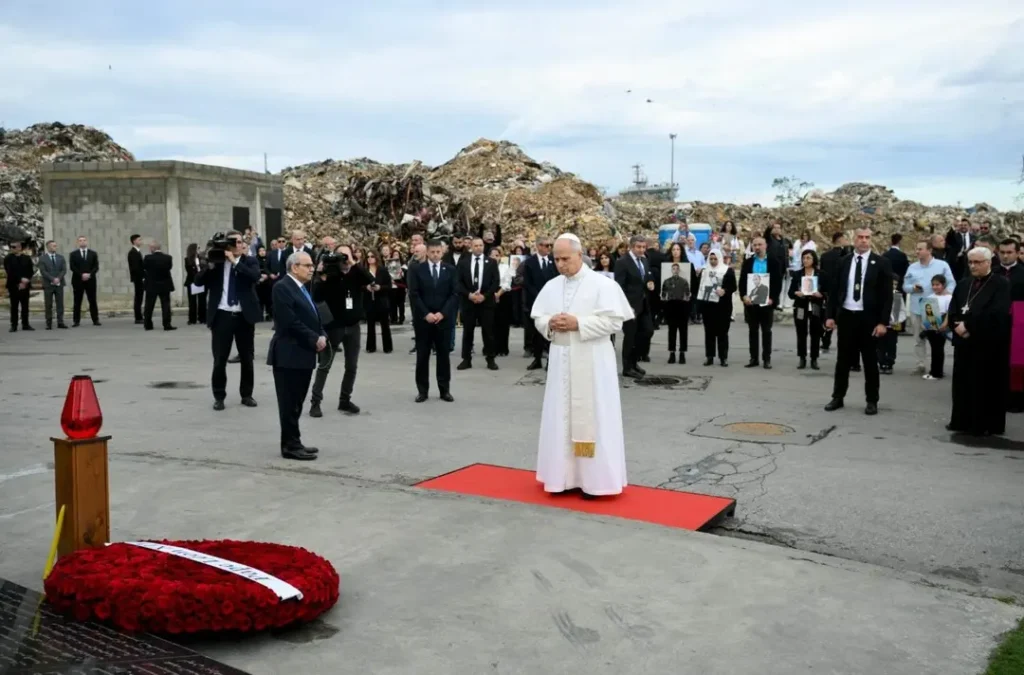 Tại nơi tưởng niệm các nạn nhân vụ nổ, Đức Thánh Cha được Thủ tướng Libăng đón tiếp. Ngài dừng lại trong giây lát để cầu nguyện thinh lặng trước đài tưởng niệm các nạn nhân vụ nổ cảng Beirut, đặt một vòng hoa và thắp một ngọn đèn tưởng nhớ các nạn nhân.