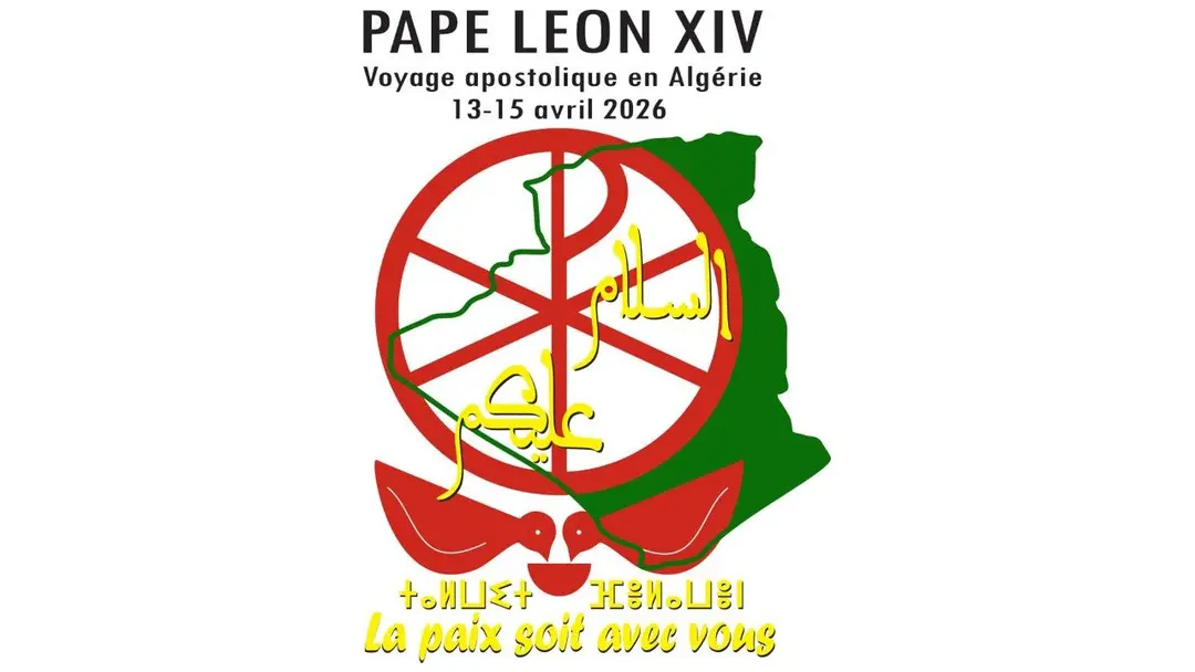 Logo cho chuyến viếng thăm Algeria, từ ngày 13-15/4/2026, lấy cảm hứng từ một bức phù điêu cổ, có hình hai con chim bồ câu đang uống nước từ cùng một chiếc cốc, biểu tượng của hòa bình và sự hiệp thông, cùng với biểu tượng “Chi Rho” của Kitô giáo và bản đồ Algeria.