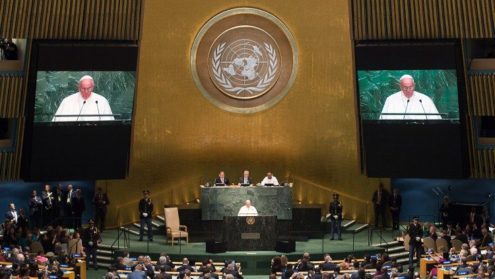 Cách đây 5 năm, 2015, Đức Thánh Cha đã tới thăm trụ sở Liên Hiệp Quốc ở New York. Nhân dịp đó, Đức Thánh Cha đã có một bài phát biểu quan trọng trước đại diện của tất cả các quốc gia, trong đó ngài kêu gọi sự quan tâm đến người nghèo và biến đổi khí hậu. Ngài nói: “Thế giới yêu cầu các giải pháp khẩn cấp và hiệu quả”.