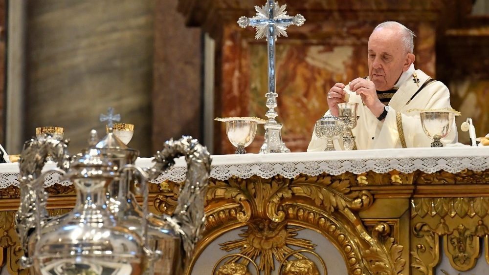 Lúc 10 giờ sáng ngày 1 tháng 4, thứ Năm Tuần Thánh, Đức Thánh Cha Phanxicô đã chủ sự Thánh lễ truyền Dầu tại bàn thờ Ngai tòa trong đền thờ thánh Phê-rô.