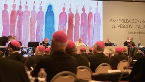 Hai năm đã trôi qua kể từ lần cuối các giám mục Ý nhóm họp. Trong khi đó, sau khi đại dịch bùng phát, đã có nhiều thay đổi. Cả địa điểm của cuộc họp cũng buộc phải di chuyển, từ hội trường Thượng Hội đồng ở nội thành Vatican, nơi mà trong lời chào mừng, Đức Hồng y Gualtiero Bassetti, Chủ tịch Hội đồng Giám mục Ý, nói là “Nhà của Đức Giáo hoàng, nơi chúng con cũng cảm thấy một chút của chúng con, đến khách sạn Ergife ở đường Aurelia của Roma. Đây là nơi tổ chức các cuộc thi, rộng hơn và phù hợp hơn để thực hiện các quy tắc cần thiết về an toàn sức khỏe.